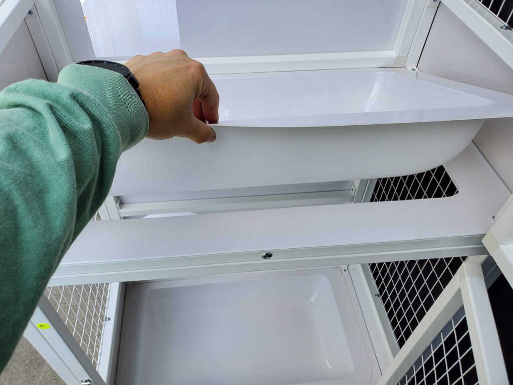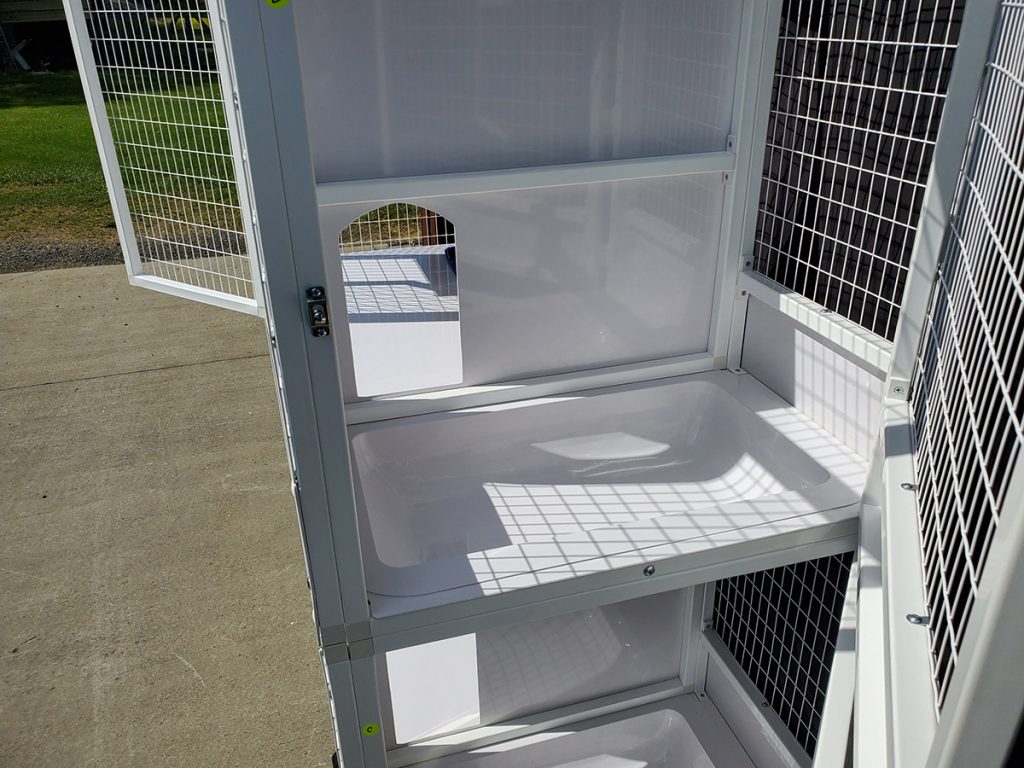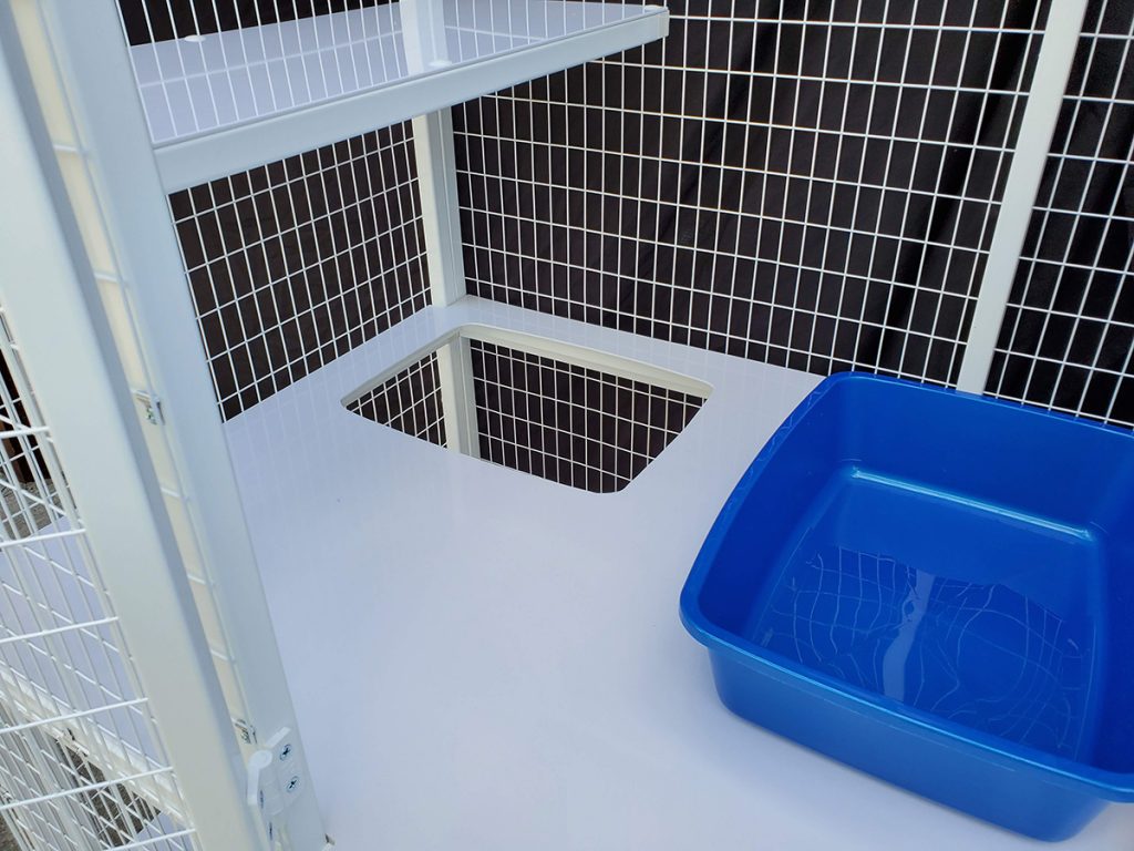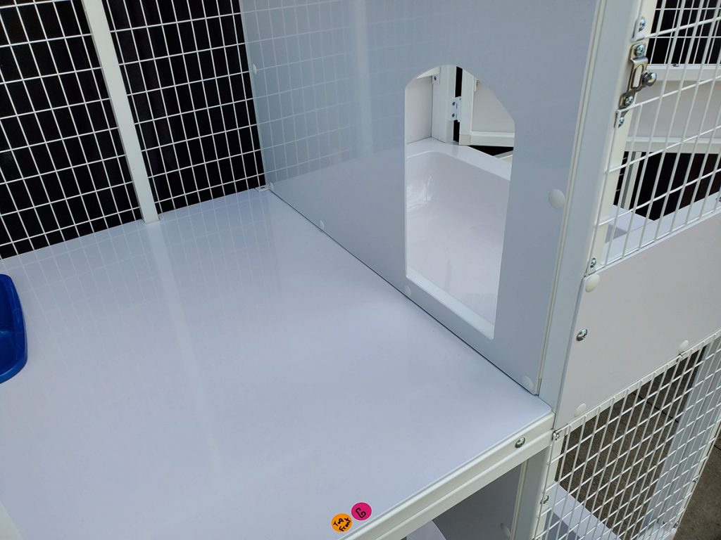 - Recessed litter pan & kittening tray on upper level (removable pan & tray)