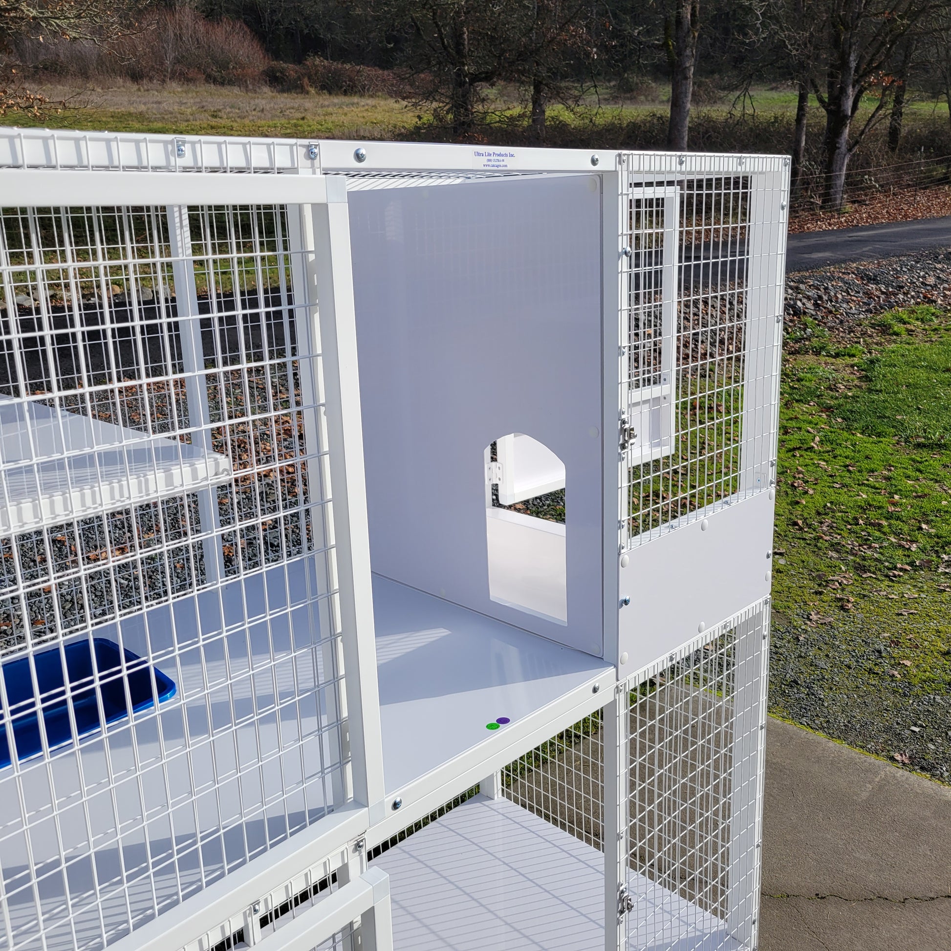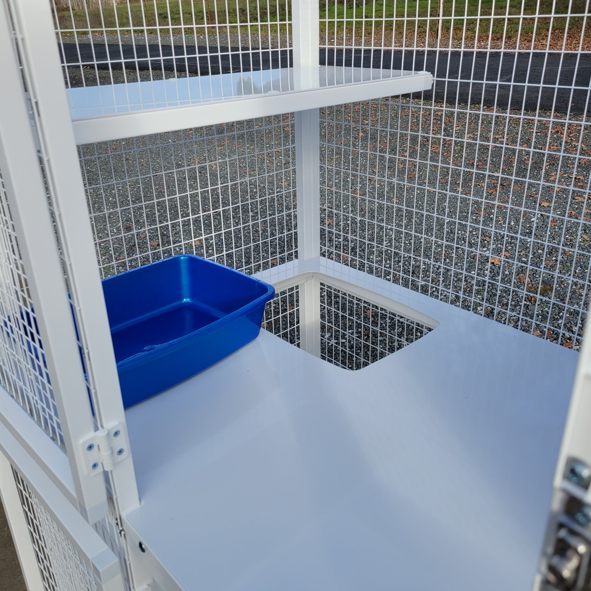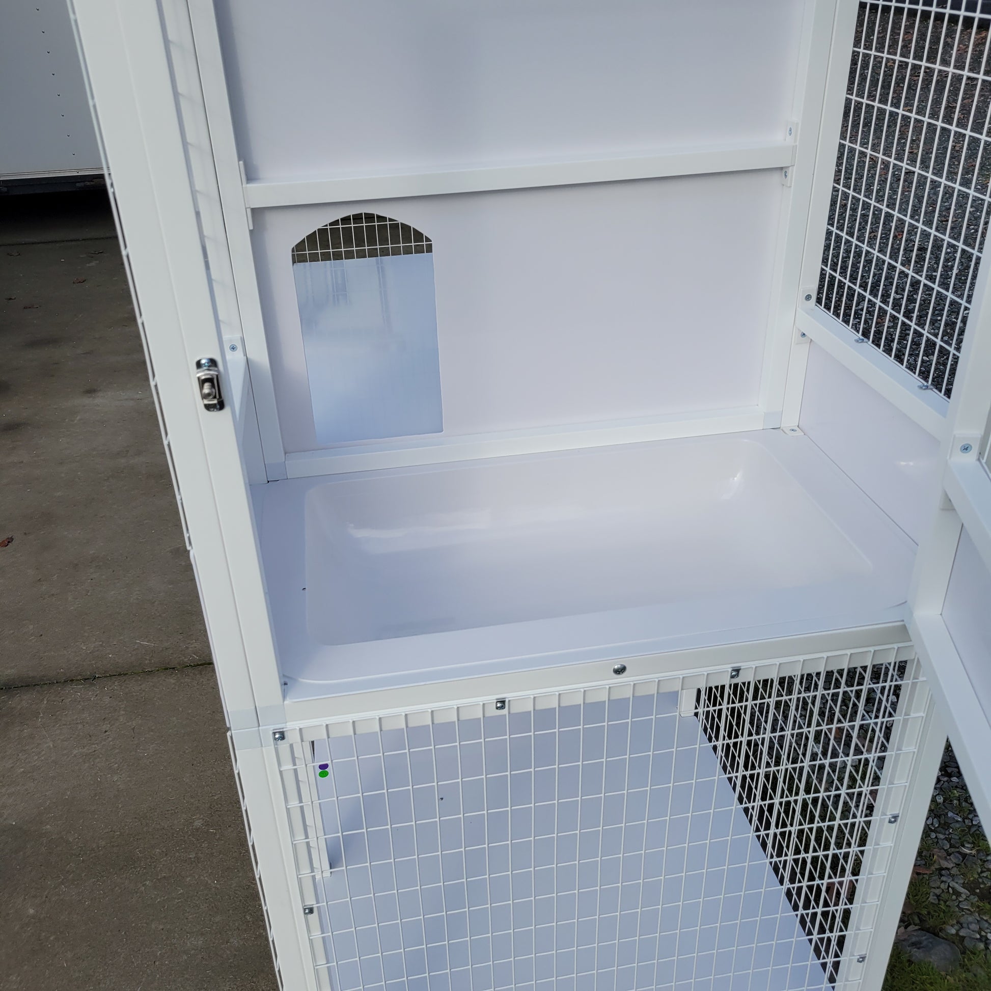 - Recessed litter pan & kittening tray on upper level (removable pan & tray)