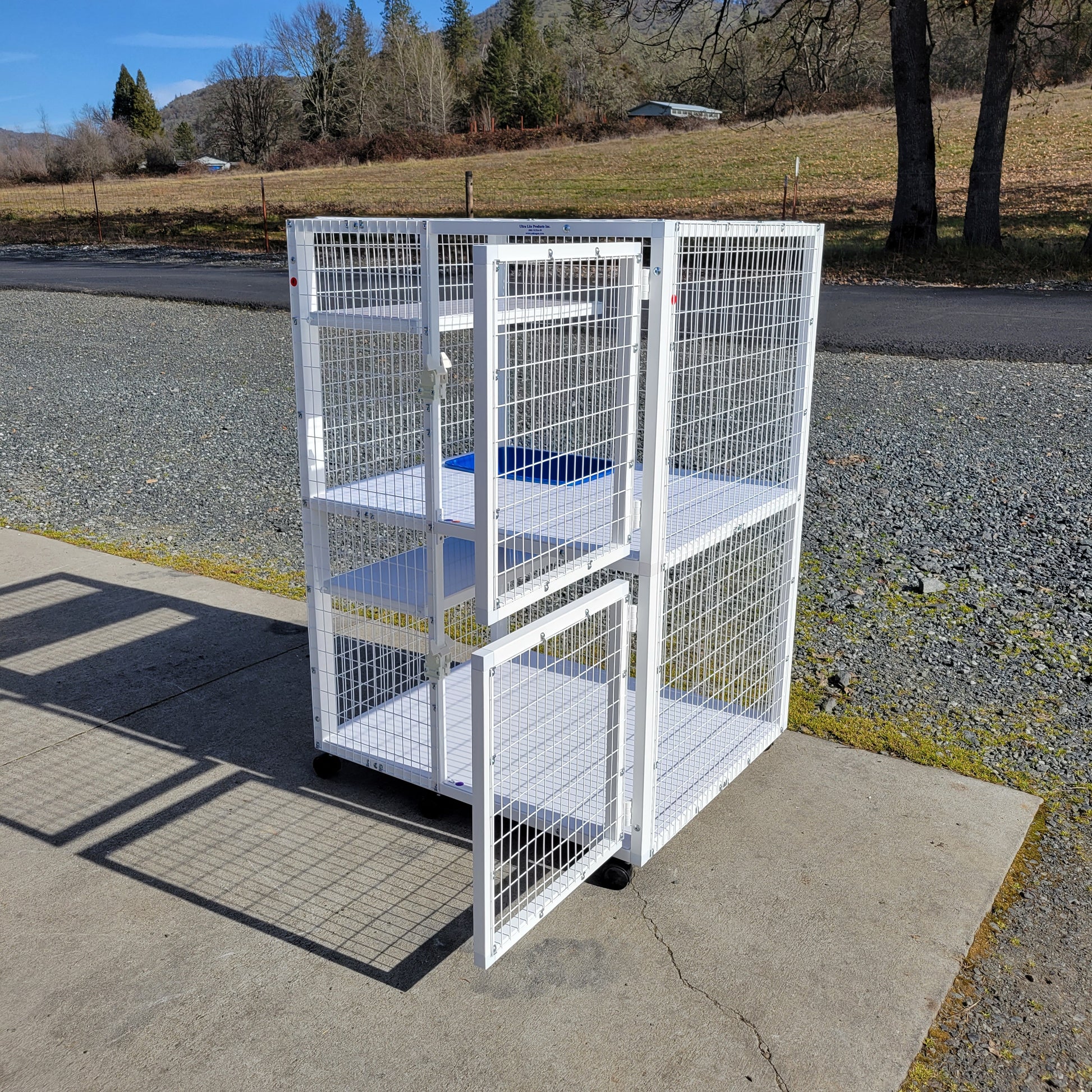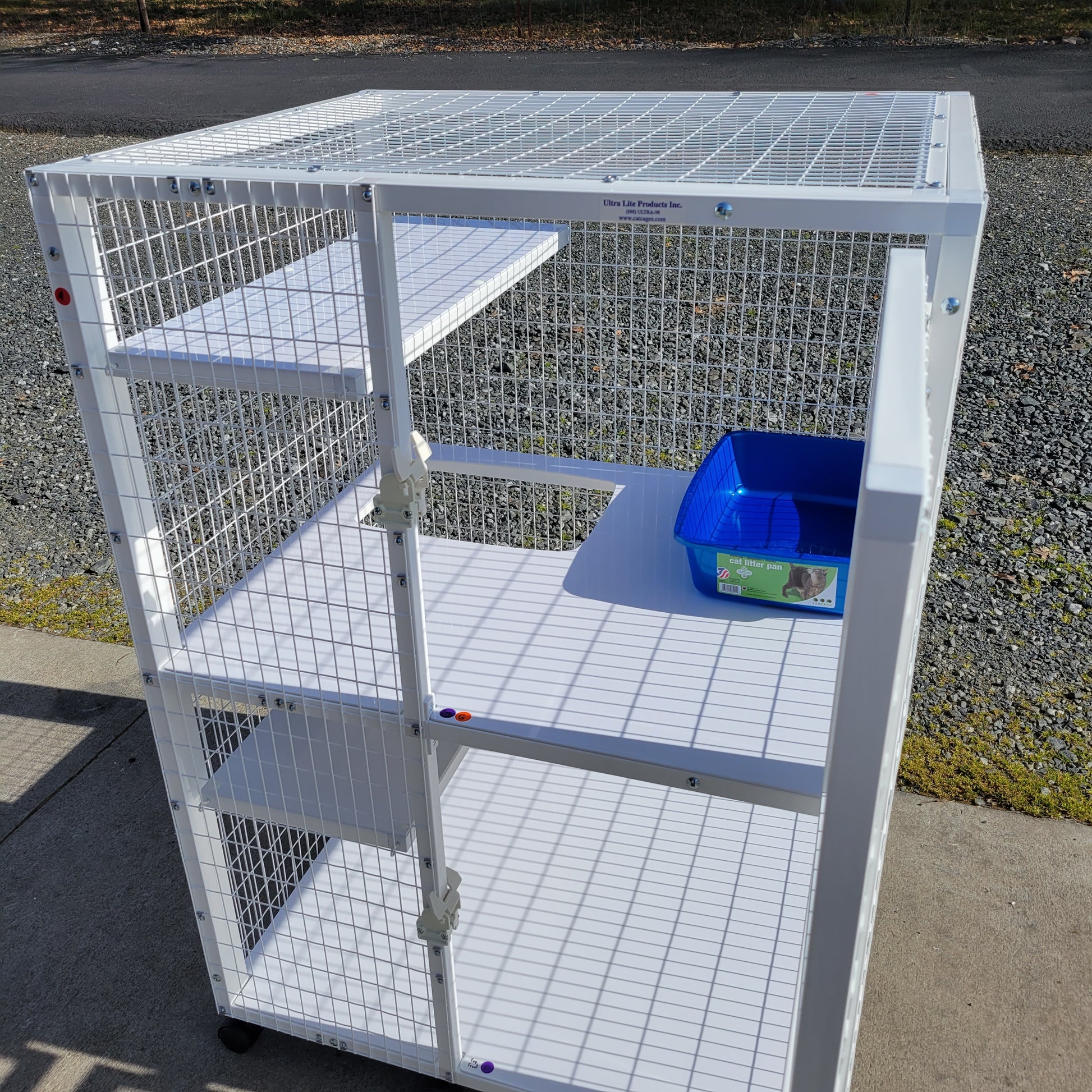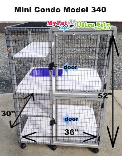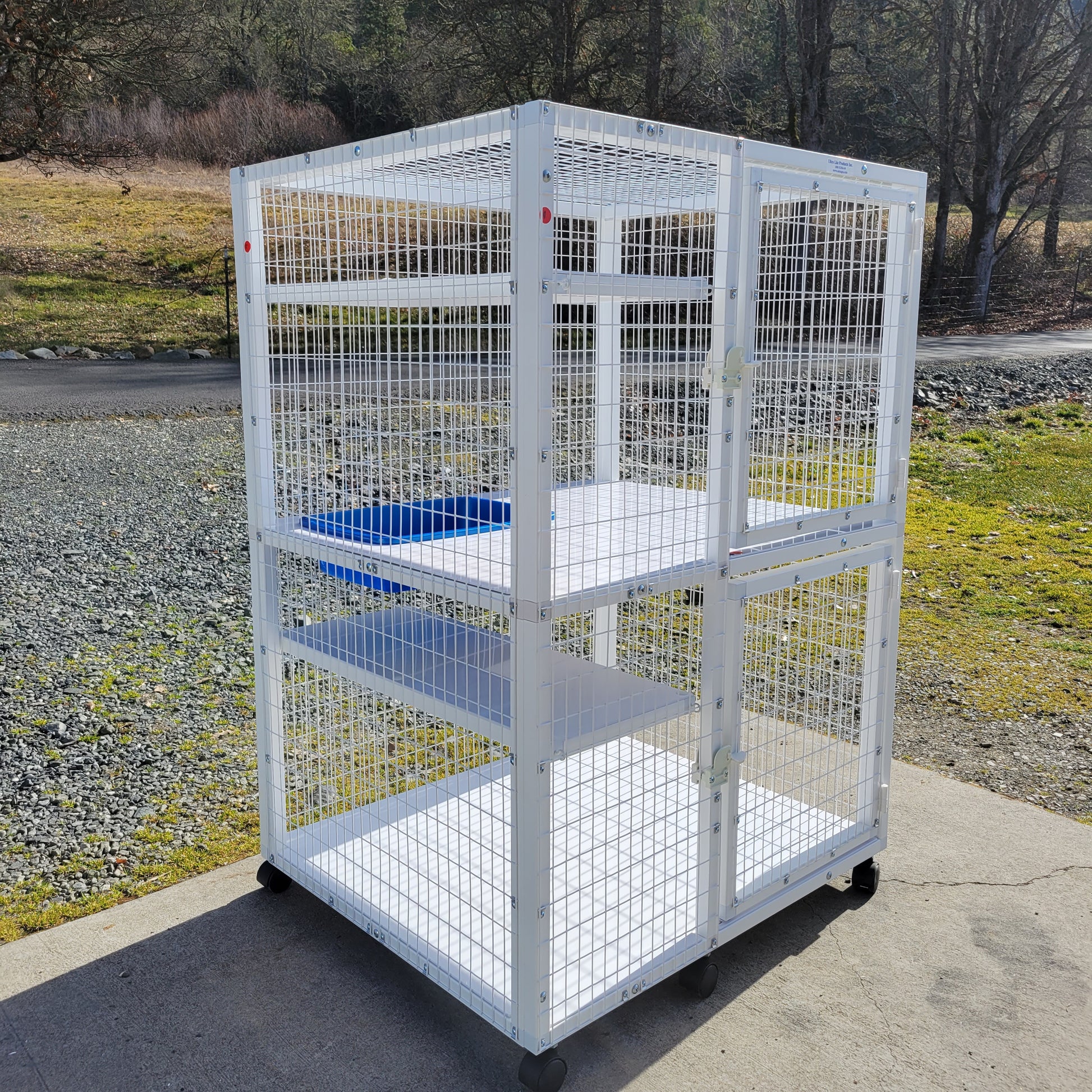 This two-level unit is 52" tall, 36" wide and 31" deep. Comes with a floor and casters, two shelves (one for each level) and has a divider with a recessed litter pan. The litter pan can be removed for access to both levels. This enclosure also has two separate doors. Options include a Stand.