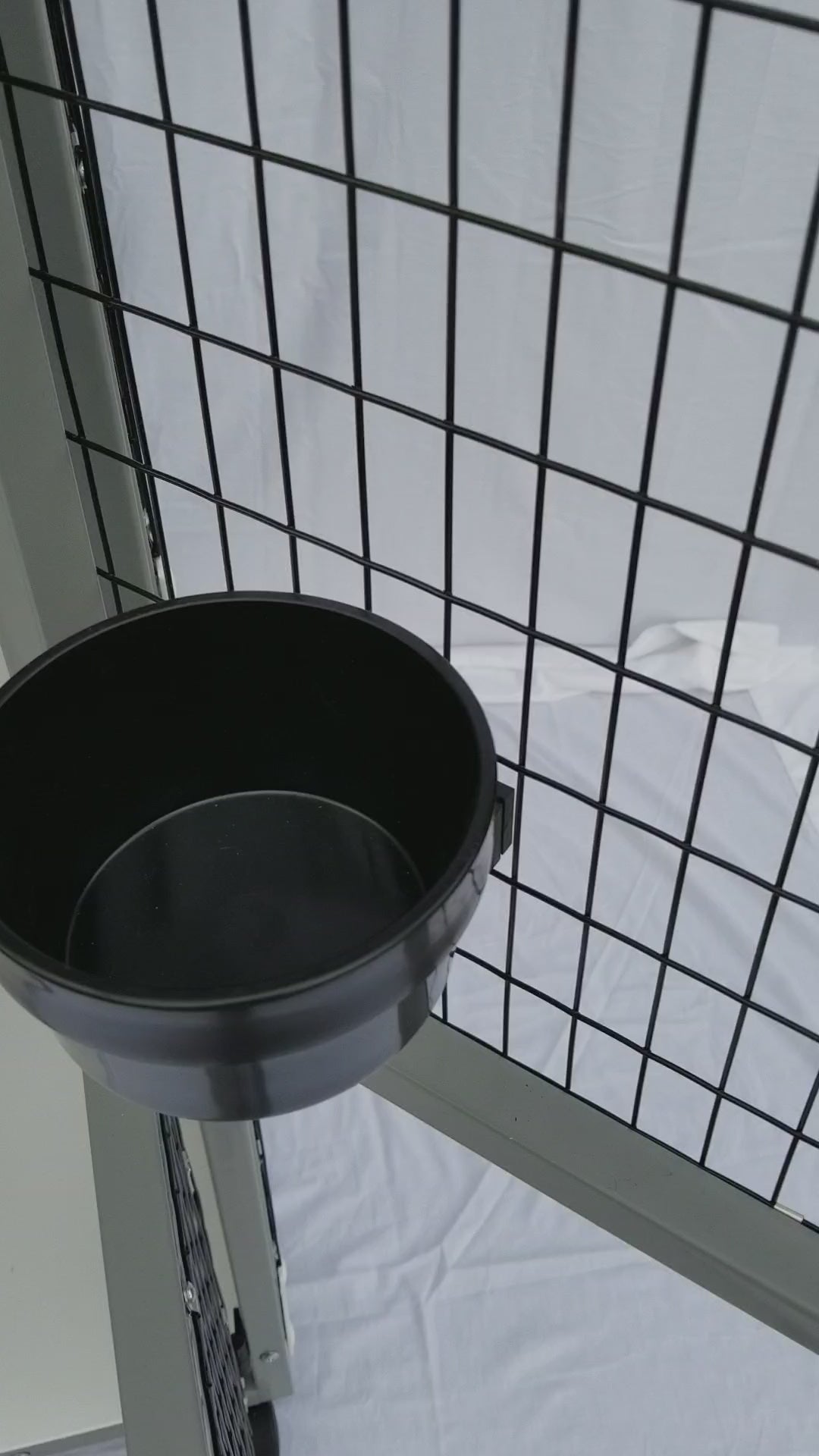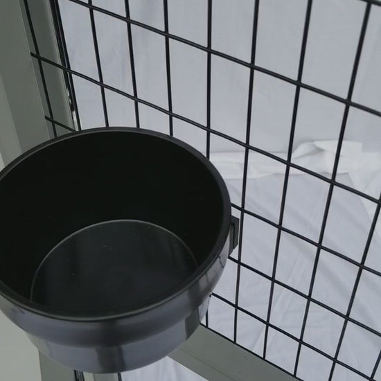 20 oz easy release bowls that fit on wire. The bracket remains attached to the cage, while the bowl can be turned 180 degrees and lifted out to clean and refill. Prevents spillage.