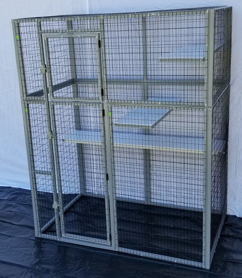 This is one of our most popular units. Standing six feet tall, 5' wide, and 3' deep. This unit is a great stud cage, or for your cats to go outside and get some fresh air, in their "Catio" without getting in too much trouble. Also great to put up against a pet door, so you can keep the litter outside, or let them go out whenever they please. Comes with a 6' walk-in door, two 3' shelves, and one 5' shelf that goes across the entire back of the cage. no floor